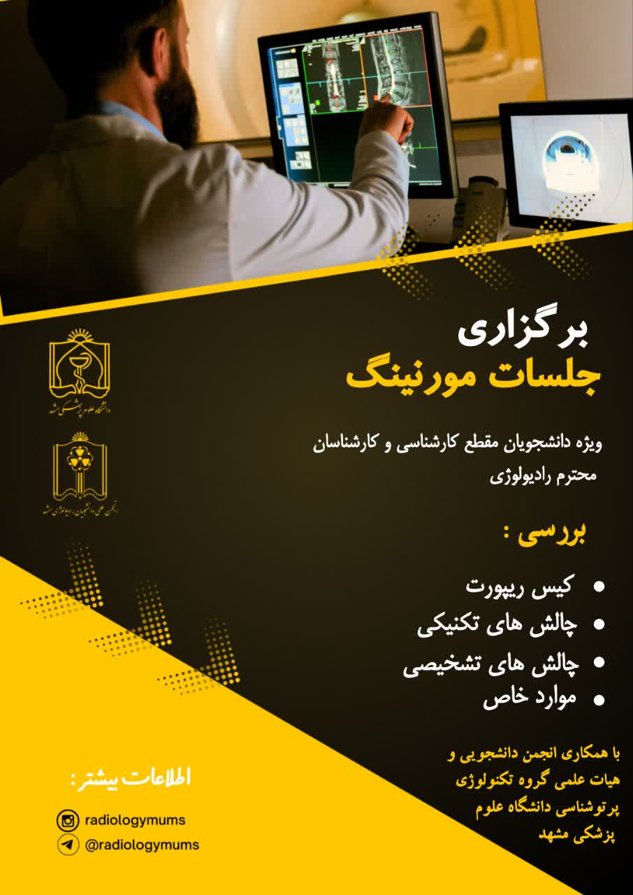 جلسات مورنینگ با هدف افزایش آگاهی علمی، بررسی مطالب دارای اهمیت و موارد خاص مشاهده شده در مدالیته های مختلف تصویربرداری به صورت کیس ریپورت برگزار می گردد.